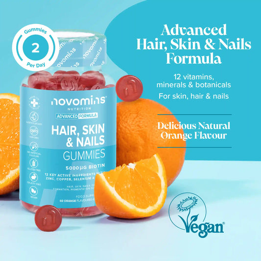 - Haar, Haut & Nägel: Wenn es uns an Nährstoffen mangelt, zeigen sich oft Anzeichen von Stress in unserem Haar, unserer Haut und unseren Nägeln. Haare können dünn und matt werden. Die Haut kann unter Pickeln und Trockenheit leiden, und Nägel können brüchig werden. Novomins Palette von nährenden veganen Gummies für Haar, Haut & Nägel hilft Ihnen, zu Ihrem alten Selbst zurückzukehren.